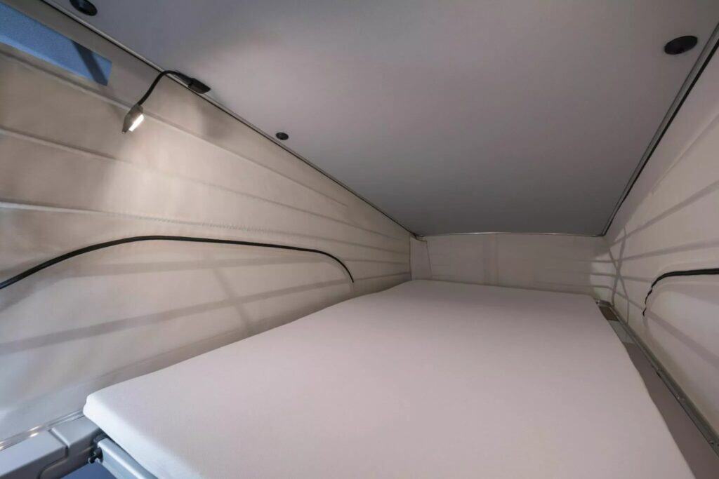جميعنا نعرف أن سيارات الفان والتخييم تتيح طيّ المقاعد وتحويلها إلى سرير للنوم، لكن الجديد هو مساحة النوم المضاعفة في مرسيدس ماركو بولو من خلال إضافة منبثقة أعلى السقف، الذي أُعيد تصميمه بهيكل من الألمنيوم مع إضاءة محيطية LED قابلة للضبط، ويوجد سريرًا بمقاس 2.05 × 1.13 متر (6.7 × 3.7 قدم).