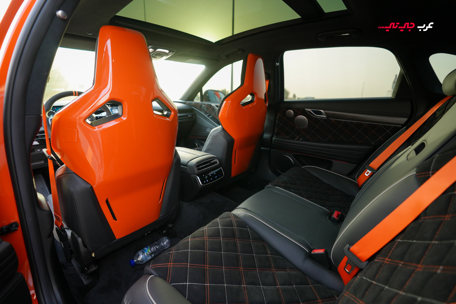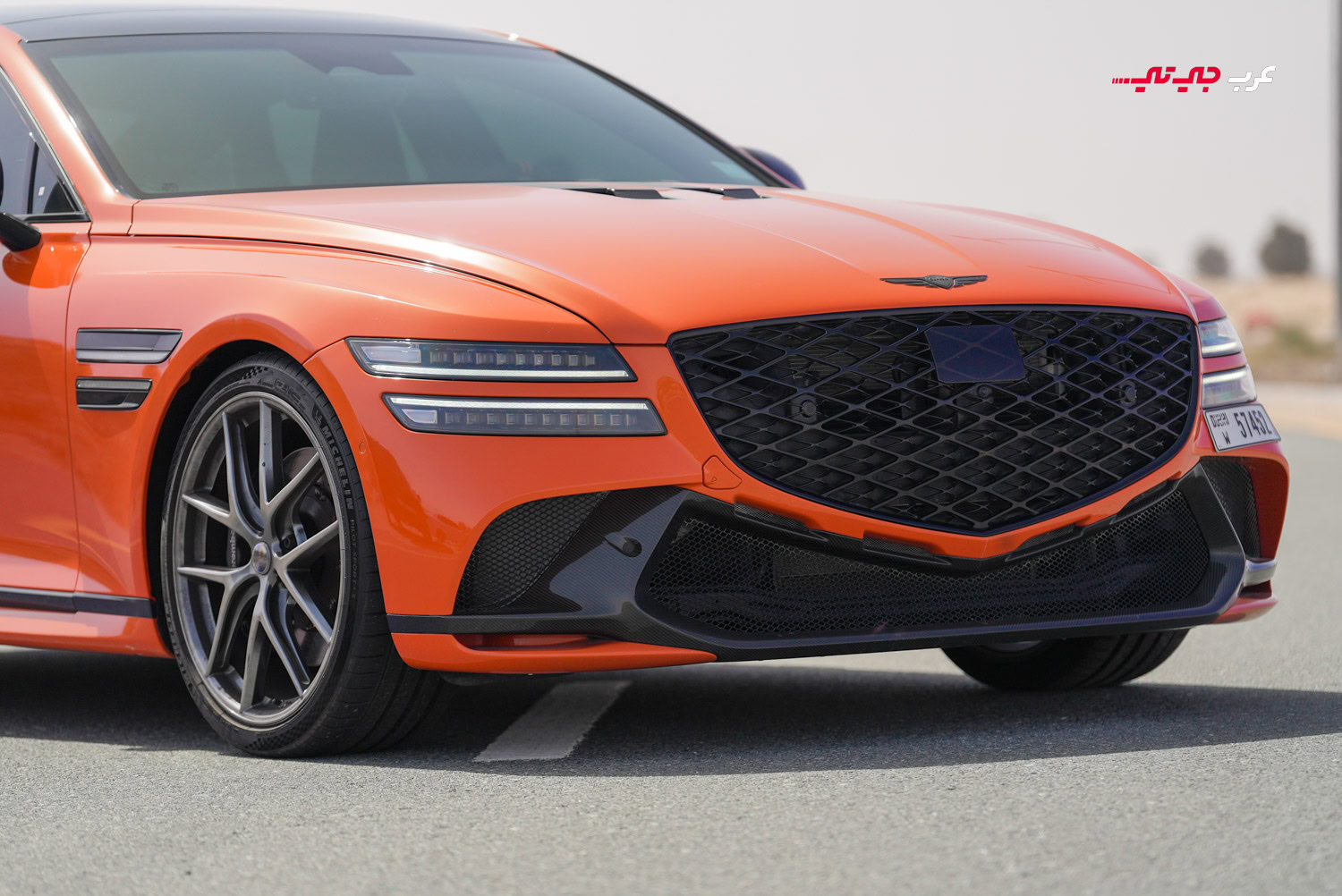 بمجرد النظر إلى السيارة، ستدرك أنها ليست G80 عادية. لون الماجما البرتقالي الأصلي (وليس مجرد ملصق) يخطف الأنظار، مقترناً بلمسات رياضية دقيقة: